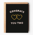 "Congrats You Two" card featuring intertwined hearts in gold and soft pink text on a sleek black background. A modern and stylish card to celebrate engagements, weddings, or any special couple’s milestone.